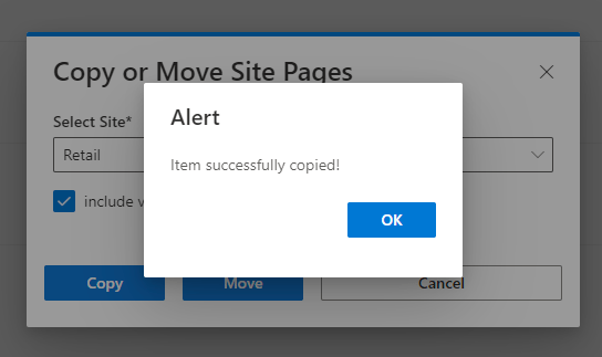 - Select Site Pages – To begin, navigate to the site page you wish to copy. Upon selecting one or more pages, you’ll notice the dynamic appearance of the ‘Copy/Move to Site’ button.